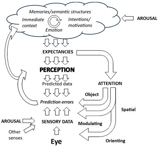 Generative model of visual perception. The perception is driven by expectations which are created by a complex interaction of higher-level cognitive functions. Predictions of incoming sensory data drawn from that perception are then compared with actual sensory data, with the perception then being modified to minimize any mismatch. Expectations also drive attention and action to focus the gathering of sensory data on areas that are most relevant to testing predictions. Further details are in Collerton et al., 2023 [3].