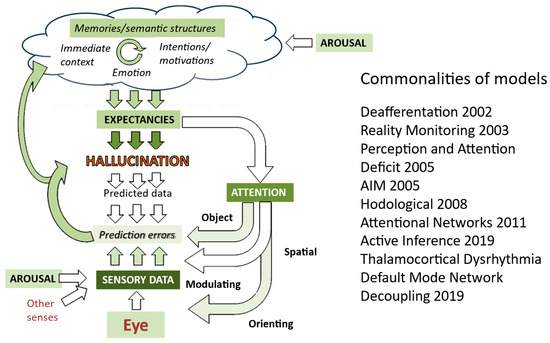 Consideration of the Consensus Framework as it applies to discriminative and generative inference (Figure 7 and Figure 9) can provisionally identify a limited number of variables which are directly linked to the hallucinatory representation. Hence, sensory data and attentional modulation of already gathered sensory data, together with expectations of specific perceptual representations, are key factors. Other functions such as context or orienting attention have indirect effects via these factors and so are of secondary importance. Focusing on these three key variables with algorithms aimed at either minimizing free energy or maximizing shared information should produce testable models.