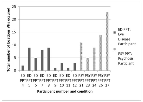 Data from daily diaries collected over a one-month period on total number of locations that participants with either eye disease (ED) or psychosis (PSY) recorded visual hallucinations (VH). Taken from Hannant, 2016 [23].