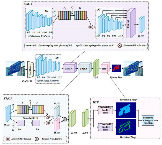 The overall structure of HTBNet designed in this paper is illustrated in Figure 1, which consists of four components (Backbone, MSCA, FMCS, and HTB). The backbone extracts features from the input image, and then the neck (MSCA, FMCS) further processes and fuses these features. Finally, the detection heads (HTB) predict text regions based on the fused features, and post-processing is applied to obtain the final text regions. Four components of the proposed HTBNet are the following: (1) ResNet50 [28] is adopted as the backbone to gain multi-scale feature maps. (2) MSCA fuses the multi-scale feature maps obtained from the backbone. (3) FMCS simultaneously integrates information of fused feature maps from MSCA in channel and spatial. (4) HTB inputs the feature maps obtained by FMCS into the corresponding prediction head to obtain the probability map and threshold map. Then, our designed hyperbolic tangent function computes the values in the probability map and threshold map to obtain the initial binary map. The final text regions are obtained after post-processing of the binary map. The structure details of the MSCA, FMCS, and HTB modules are explained in Section 3.2, Section 3.3, and Section 3.4, respectively.