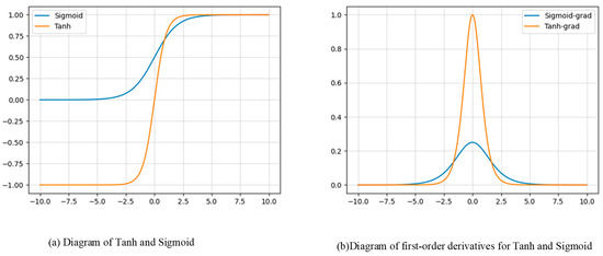 Here, represents the total loss function, while represents the learning rate. And is the initial weight coefficient, and is the updated weight coefficient corresponding to it. Based on the theoretical foundation above, we calculate the first-order derivatives of the two functions, and the resulting diagram is shown in Figure 2b. It is evident that Tanh’s grad is steeper than the sigmoid’s grad, which means that for the same variable step, the function value of the hyperbolic tangent function changes more significantly than the sigmoid. Subsequent experiments prove that the weight coefficients of the hyperbolic tangent function decay faster than those of the sigmoid, resulting in faster convergence of the overall model.