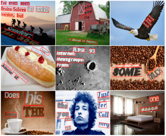 - Yao, C.; Bai, X.; Liu, W.Y.; Ma, Y.; Tu, Z.W. Detecting Texts of Arbitrary Orientations in Natural Images. In Proceedings of the 2012 IEEE Conference on Computer Vision and Pattern Recognition (CVPR), Providence, RI, USA, 16–21 June 2012; pp. 1083–1090. [Google Scholar]