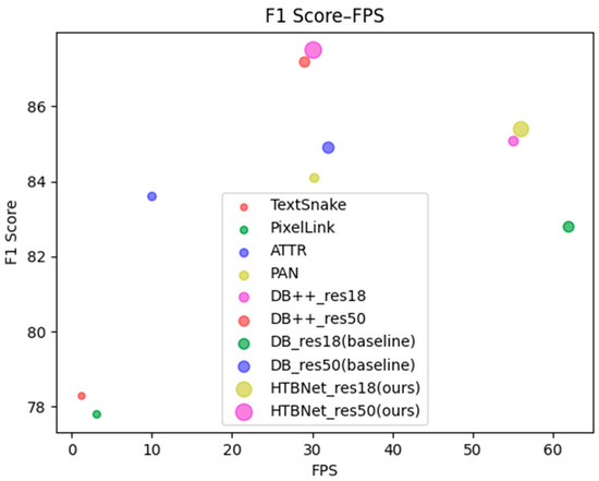 We also compare our method with the previous advanced methods, and the results are presented in Table 8 and Table 9. It can be observed that when we utilize Res50 [28] as the backbone network, HTBNet achieves F-measures of 86% and 87.5% on datasets Total-Text and MSRA-TD500, respectively, outperforming the performance of the previously mentioned methods in Table 8 and Table 9. At the same time, to make the model more lightweight, we also use Res18 [28] for comparison. The model speed was significantly improved, with FPS increasing from the initial 30 to 49 and 56 on Total-Text and MSRA-TD500, respectively, and for the detection performance, the F1 Score remains competitive. According to Table 9, we plot a two-dimensional scatter plot of performance versus speed on MSRA-TD500, as shown in Figure 7. The horizontal axis represents the FPS of the model, and the vertical axis represents the F1 Score of the model. From both the performance and speed perspectives, our model achieved the best results.