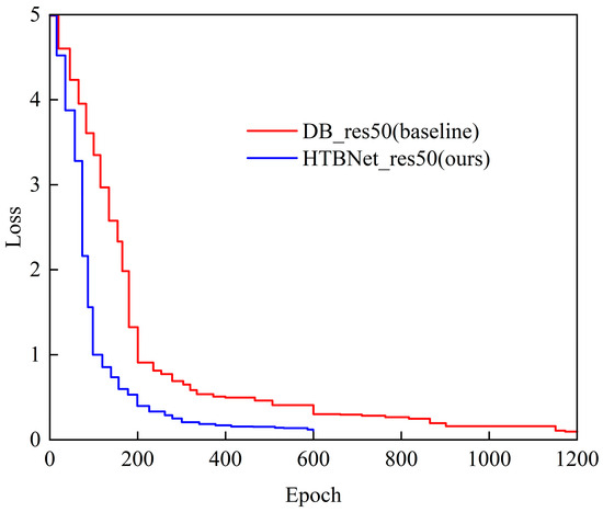 As shown in Figure 8, HTBNet_res50 (ours) compared to DB_res50 (baseline) indicates that our model essentially converges at 600 epochs, while the DB_res50 converges at 1200 epochs. This is consistent with the inference conclusions from Figure 2.