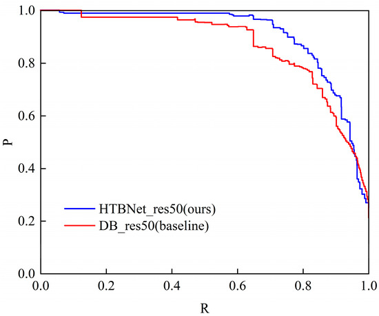 As shown in Figure 9, the precision–recall curves of HTBNet_res50 (ours) and DB_res50 (baseline) indicate that the HTBNet_res50’s curve completely encloses the DB_res50’s curve, leading to the conclusion that our model performs better.