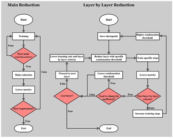 The main flow of automatic condensation reduction begins with training the original model and periodically testing its performance. Once the test meets the main reduction criteria, main reduction is carried out. After the main reduction, the reduced model continues training until it meets the main reduction criteria again, and this cycle repeats until the model reduction reaches the anticipated extent. After each main reduction, the criteria for the next main reduction are slightly lowered because reduction inevitably affects the network’s performance. Keeping the same criteria would make the reduction cycle very slow or even impossible, wasting a lot of time on model training.