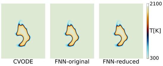The simulation of combustion requires integrating computational fluid dynamics (CFD) with chemical reactions. In this task, a fully connected neural network computes the rate of change of chemical substances as source terms for the CFD. The CFD code used is EBI [26], and the chemical mechanism employed is the drm19 mechanism for methane, which involves 21 components and 84 reactions. In the depicted turbulent ignition test, as shown in Figure 2, a computational domain of 1.5 cm × 1.5 cm is set with 512 × 512 cells. The velocity field is generated using the Passot–Pouquet isotropic kinetic energy spectrum. The initial conditions are set at , , and . An ignition round is placed at the center of the domain, with a radius of 0.4 mm. Figure 2 compares the results at 1ms simulated using the fully connected neural network and CVODE, both utilizing EBI. For more details, please refer to the original text [11].