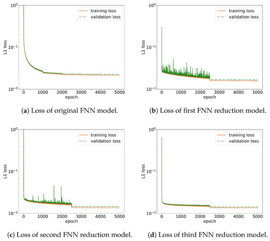 Training loss and validation loss of the FNN models. The subfigures (a–d) illustrate the training and validation losses of the original fully connected neural network model through to its third reduction.