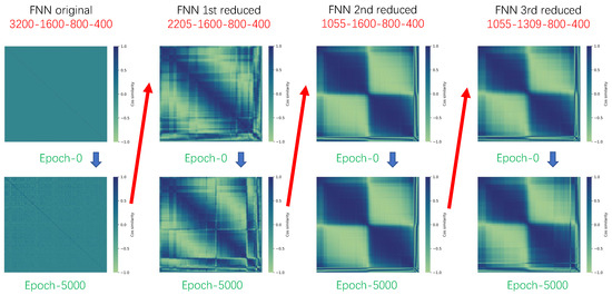 Cosine similarity matrices of 2nd layer on different stages. In the matrix heatmap, the element in the i-th row and j-th column represents the cosine similarity between the i-th neuron and the j-th neuron. The more distinct the blocks in the cosine matrix, the stronger the condensation of the neural network. From left to right, the images correspond to the original fully connected neural network model through to the model after the third reduction. “Epoch 0” indicates that the model has just been reduced and has not yet been trained. “Epoch 5000” represents the fully connected neural network model upon completion of training.