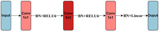Convolutional block of MobileNetV2. In figure, ‘Conv ’ refers to layers where the convolutional kernels are , with the number of channels and the number of kernels varying in each layer. ‘Conv ’ indicates layers where the convolutional kernels are , with one channel, and the number of kernels may vary per layer. ‘BN’ stands for batch normalization, while ‘ReLU6’ and ‘Linear’ refer to activation functions.