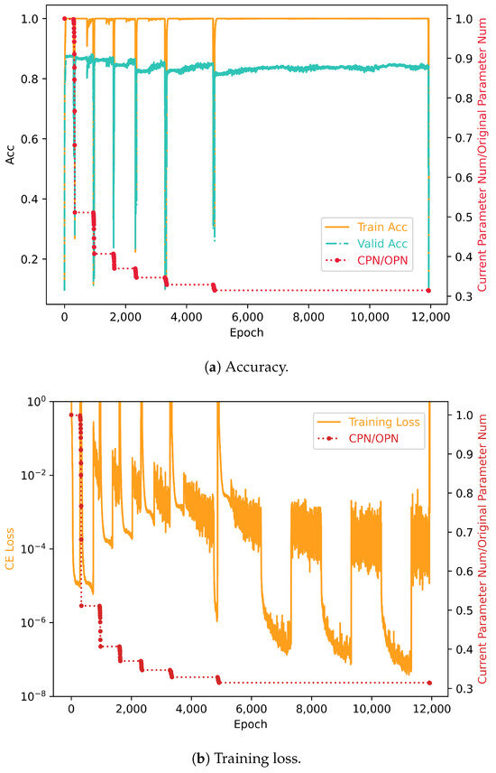 Our experiments continued until the completion of the sixth major reduction, with the third to sixth major reductions starting at steps 1601, 2316, 3286, 4867, and 11,919, and ending at steps 1633, 2362, 3351, 4921, and 12,127, respectively. The initial main reduction criteria at the start were 0.87343, 0.86641, 0.85904, 0.85315, and 0.85018, while the layer-by-layer reduction criteria were 0.83343, 0.82641, 0.81904, 0.81315, and 0.81018, respectively. The parameter counts of the reduced models were 827,032, 776,011, 735,527, 704,004, and 669,228, respectively; after the sixth major reduction, the reduced model’s parameters accounted for only 29.9% of the original model. It can be observed that each subsequent reduction became increasingly difficult, with longer training steps required, aligning with the expectation of approximating the ideal subnetwork. Each layer’s reduction still kept the model’s performance relatively unchanged. By the time of the sixth reduction’s completion, there had been a total of 96 successful reductions, with a parameter decrease of 1,567,454, but only a slight decrease in the model’s validation set accuracy, achieving 83.13%, which is not significantly lower than the historical highest validation set accuracy of 88.16%.
