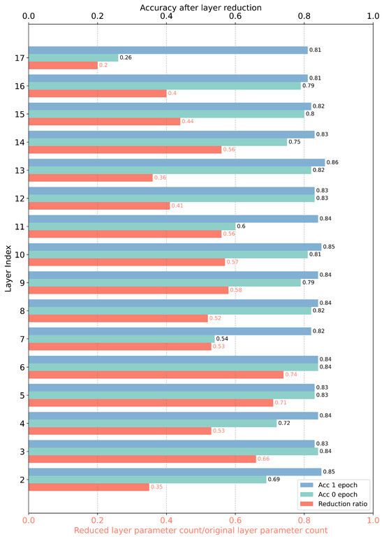 First time of main reduction. The red reduction ratio indicates the proportion of the layer’s parameters after reduction relative to the original number of parameters; a smaller ratio suggests a greater reduction. The green “Acc 0 epoch” represents the accuracy of the network after reduction without any further training, while the blue “Acc 1 epoch” represents the accuracy of the network after reduction with only one step of training.