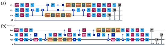 In conclusion, this study demonstrates the significant impact of several factors on algorithm performance and the effectiveness of error mitigation across eight IBM QPUs. These factors include circuit fidelity, schedule duration, choice of hardware-native gates, algorithm implementations, types of DD sequences, and optimization levels. Despite minimal performance variations between Carr–Purcell–Meiboom–Gill (CPMG) and XY4 sequences, XY4 exhibits a slight advantage in success probability for larger qubit counts. However, CPMG achieves a higher overall error mitigation success rate, suggesting potentially greater robustness. While the results highlight the general enhancement of algorithm performance and robustness through the use of DD sequences, achieving significantly improved performance relies more critically on factors such as high-quality native gates of QPUs, symmetric algorithm implementation, and effective circuit optimization techniques. Therefore, a holistic approach that considers both hardware characteristics and software optimization strategies is important when designing quantum algorithms to maximize reliability and efficacy. This study underscores the importance of hardware considerations and circuit design in enhancing algorithm performance and robustness using DD sequences. These insights guide the development and optimization of other quantum applications. Future research directions include investigating the interplay between these factors when combining DD sequences with other error mitigation strategies, such as zero-noise extrapolation [54,55]. Additionally, exploring the relationship between circuit symmetry and its effectiveness in suppressing errors could provide valuable insights. Extending this analysis to other quantum algorithms, such as the VQE and protocols for preparing Greenberger–Horne–Zeilinger (GHZ) states, holds promise for revealing the broader applicability of these findings.