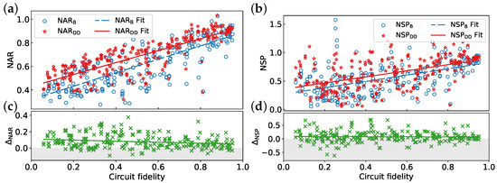 Impact of circuit fidelity on algorithm performance and DD effectiveness: (a) normalized approximation ratio (NAR), (b) normalized success probability (NSP), (c) improvement in NAR after applying DD (), and (d) improvement in NSP after applying DD (). Higher values of , , , and indicate better performance on actual quantum devices. Values exceeding unity indicate that the performance achieved on the IBM quantum hardware surpasses the results obtained from the noise-free simulation. Positive values of and demonstrate improvements due to DD. The CPMG sequence is used for all data points. Each line in the graph represents a linear fit of the data. The reported and are 85.55% and 66.8%, respectively.