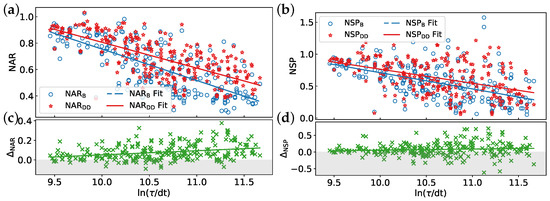 Influence of logarithmic transformation of circuit schedule duration () on algorithm performance and DD effectiveness with the same datasets as in Figure 4: (a) NAR, (b) NSP, (c) , and (d) .