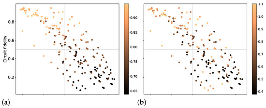 We first explore the impact of circuit fidelity on the performance. The fidelity of a circuit , denoted as , measures the agreement between the actual operation of a quantum circuit and its ideal operation. The circuit fidelity can be mathematically represented as