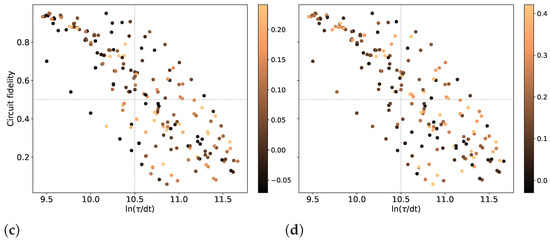 Figure 6a–d illustrate the impact of circuit fidelity and schedule duration on , , , and , respectively. As observed in Figure 6a, exhibits degradation with increasing logarithmic schedule duration () and decreasing circuit fidelity. High performance is concentrated in the region where the schedule duration is below and circuit fidelity surpasses 0.5. Conversely, low performance is primarily observed for exceeding and fidelities below 0.5. A similar trend is evident for in Figure 6b. However, unlike , achieving a high value remains feasible even for longer schedule durations and lower fidelities. This suggests that is less sensitive to these factors compared to . Figure 6c,d further demonstrate the effectiveness of DD sequences, particularly at longer durations. This is potentially due to the ability of DD sequences to mitigate decoherence errors that become more prominent at these timescales.