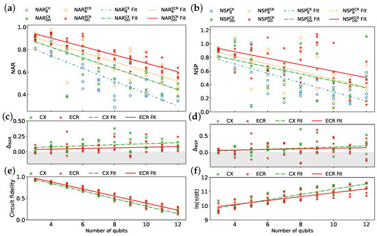 Comparison of two hardware-native gate sets: {CX, ID, RZ, SX, X} and {ECR, ID, RZ, SX, X}, denoted as CX and ECR gate sets, respectively. Results obtained using four 27-qubit quantum processing units (QPUs) ibmq_mumbai, ibmq_kolkata, ibm_cairo, and ibmq_ehningen for the CX gate set, and four 127-qubit QPUs ibm_kyoto, ibm_cusco, ibm_brisbane, and ibm_sherbrooke for the ECR gate set: (a) NAR, (b) NSP, (c) , (d) , (e) circuit fidelity, and (f) . The CPMG sequence is used for all data points. Each line represents a linear fit to the corresponding data.