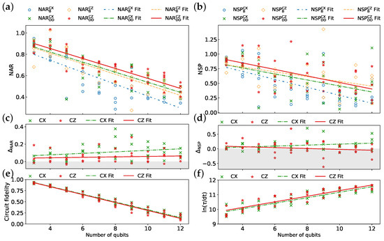 Benchmark results obtained from the two QPU sets are presented in Figure 7. Table 4 summarizes average values of metrics and parameters derived from the linear fits of these metrics against the number of qubits. As shown in Figure 7a,b, applying DD sequences generally improves the NAR and NSP, respectively, for both native gate sets. The highest performance is achieved with and , which leverages ECR-based QPUs and incorporates DD sequences. Moreover, QPUs utilizing the ECR gate exhibit consistently higher baseline performance, and , compared to those with the CX gate, and , even surpassing those with DD sequences, , and . This observation suggests that the selection of QPUs may be more critical for achieving optimal performance than relying solely on DD techniques. As shown in Figure 7c,d, DD effectiveness improves as the qubit count increases for both gate sets. Moreover, the CX gate set exhibits higher DD effectiveness than the ECR gate set. As illustrated in Figure 7e,f, the ECR gate produces an overall higher circuit fidelity and lower schedule duration, potentially contributing to higher performance. Analyzing the proportion of positive outcomes in the experimental data presented in Figure 7c,d, we observe that the reported values of and are 92.5% and 72.5% for the CX gate, respectively, whereas the corresponding values are 75% and 62.5%, respectively, for the ECR gate, suggesting that DD sequences are more robust in mitigating errors for the CX gate set.