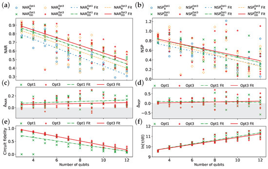 Figure 10a,b demonstrate that Opt3 with DD sequences achieves the highest overall performance in terms of NAR and NSP, followed by Opt1 with DD sequences. Without error mitigation, Opt3 outperforms Opt1 for all tested qubit counts in terms of NAR, whereas, for NSP, Opt3 exhibits an advantage only for a small number of qubits, with comparable performance achieved at larger qubit counts. The average improvement in NAR due to DD () is generally higher for Opt1 compared to Opt3 (Figure 10c). However, for NSP, DD initially benefits Opt1 more, but this advantage shifts toward Opt3 for larger qubit counts (Figure 10d). Furthermore, the reported average and are 92% and 74% for Opt1, respectively, compared to 80% and 60% for Opt3, suggesting a higher robustness of DD for Opt1. It is important to note that Opt3 exhibits higher circuit fidelity (Figure 10e) and a shorter schedule duration (Figure 10f), which are crucial for high algorithm performance.