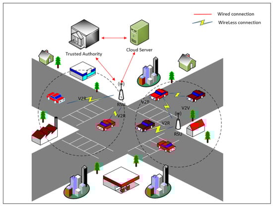 In the IoV, a federated learning system primarily includes four entities: a trusted authority (TA), cloud server (CS), roadside units (RSUs) and vehicles, as shown in Figure 1.