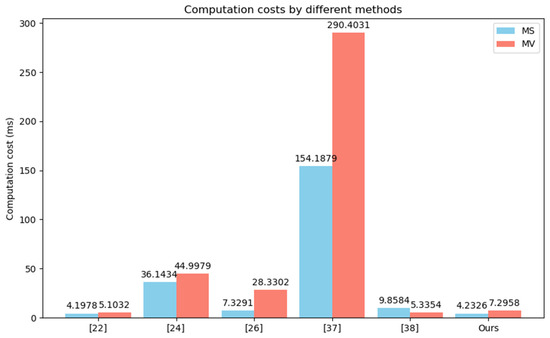 We compared the computational costs of the CPPA-SM2 scheme with other relevant schemes in terms of signature generation, single signature verification, batch verification and member management, as shown in Table 3 and Table 4, and Figure 3 and Figure 4, where “-” indicates that the property is not considered in the scheme, MS denotes the message sign and MV denotes the message verification.