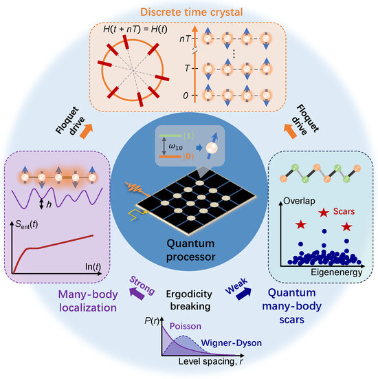 Superconducting quantum simulations of the nonequilibrium many-body physics. Quantum processor captured within the blue-circle regime, such as superconducting quantum processors, showcases the powerful capabilities in the simulation of many-body physics systems, thereof including many-body localization, quantum many-body scars, and discrete time crystal. The insert is the quantum processor with a two-level system mimicking the artificial atom. MBL can be generated in the interacting many-body system combined with strong disorder fluctuations (purple curve with a disorder strength of h), which uniquely owns the logarithmic growth in time of entanglement entropy, i.e., . QMBS refers to several special eigenstates in the middle of the spectrum weakly violating ETH, where the spaced scars in towers could contribute to the coherent revivals of local observables. The common signature of MBL and QMBS is the ergodicity breaking. But the distinction is that MBL satisfies the Poisson distribution of energy level statistics () which signals strong ergodicity breaking, whereas QMBS obeys the Wigner–Dyson distribution for weak breaking of ergodicity. Both MBL and QMBS can be exploited to protect DTC from being heated by Floquet driving, where the long-lived subharmonic response of local observables breaks the time-transition symmetry, i.e., .