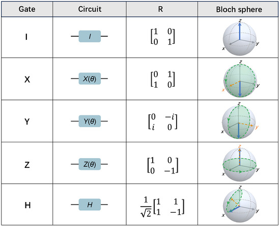 Description of single-qubit gates: I, X, Y, Z, and H gate. The gate name, circuit representation, rotation matrix R with rotation angle , and Bloch sphere representation of each gate are presented. The circuit representation will be utilized in the following context. The rotation matrix is based on eigenvectors of the operator. Bloch sphere representations capture the corresponding quantum state (blue arrow) and its rotation around the axes (orange-dashed arrow) after operator applied to the initial state of along z axis, where the rotation trajectory of the Bloch vector is unveiled by the green-dashed circuit.