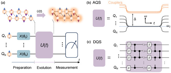 where H is the system Hamiltonian and is the final state evolved from the initial state () via the unitary time-evolution operator , i.e., . Thus, as shown in Figure 4a, quantum simulation could be realized with three steps: initial state preparation, unitary evolution, and final state measurement. For initial state preparation, a product state on a computational basis is generated by applying single-qubit gates. If the initial state is entangled, additional two-qubit gates have to be applied. It should be emphasized that the easily prepared states usually are the product states.