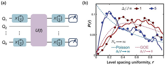 where refers the bosonic creating (annihilation) operator, is local particle number, is the on-site potential, is the on-site attractive interaction resulted from the anharmonicity, and J is the hopping rate of photons between adjacent sites. in superconducting circuits, as , Equation (12) is called the hard-core Bose–Hubbard model, which can be reduced to an isotropic XY model as described in Equation (11). The quantum circuit for probing the energy spectrum is shown in Figure 5a. Two qubits ( and ) are initialized in a superposition of and states by rotation gates with an angle of , whereas other qubits remain in the ground state. Then the unitary evolution of the 1D Bose–Hubbard quantum system is applied via AQS. Before taking projective measurements of or , and are applied with the same -rotation gates as in the state preparation. As consequence, is established. The eigenenergies in the two-photon manifold could be obtained from the peaks of the Fourier transform of a series of . Figure 5b exhibits the spectrum statistical results with system disorder strength of 1 and 5, which obey the archetypal Gaussian orthogonal ensemble (GOE), a.k.a., the Wigner–Dyson distribution, and Poisson-type distribution, respectively. These results distinguish MBL from thermalization.