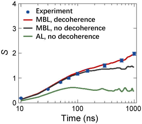 As an aside, the first observation of logarithmic growth of EE for the 1D MBL phase was accomplished by Xu et al. [78] in a 10-qubit chain, whose evolution is governed by the engineered spin- XY model with long-range interactions provided by a central bus resonator. In this experiment, QST is applied to five superconducting qubits to obtain the half-chain EE. In Figure 6, a long-time logarithmic growth of half-chain EE (blue dots) is manifested in the presence of strong disorders. In contrast, for the AL without interactions, EE saturates quickly (green line). Later, many experiments measured the dynamical EE to characterize the MBL transition [58,136,138].