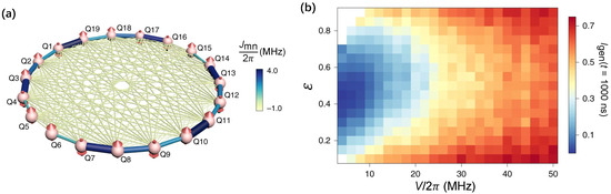 Energy-resolved many-body localization. (a) Diagram represents the 19 superconducting qubits with spin-spin interacting in an all-to-all layout, where the thickness and colors of bounds denote the coupling strength synchronously. (b) Energy-resolved () and disorder () averaged imbalance in the experiment, which agrees well with the numerical simulations. Figures are adapted from [137].