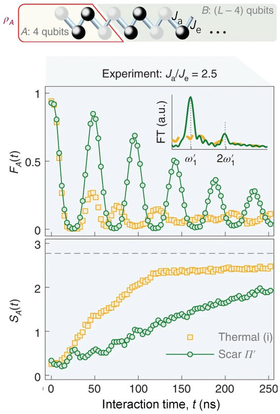 The rapid progress of quantum hardware enables the experimental observation of ergodic or nonergodic quantum dynamics [113,114,115]. EE in quantum ergodic systems has been observed in superconducting circuits firstly by Neill et al. [113], where only three qubits are involved. The ability to generate arbitrary product states establishes clear signatures of the ergodicity. Chen et al. [115] experimentally study the ergodic dynamics of a 1D chain of 12 superconducting qubits with a transverse field in the hard-core Bose–Hubbard model, and identify the regimes of strong and weak thermalization due to different initial states. A quick saturation of EE to for the strong thermalization is identified with initial states enjoying effective inverse temperature close to 0. These investigations pave the way for further exploring the emergent phenomenon of ergodicity breaking.