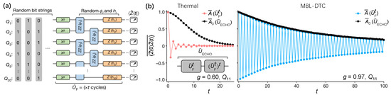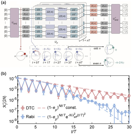 As the time step approaches 0, the decomposition results approach the actual time evolution operator . For instance, as shown in Figure 4c, the local interactions are implemented by a layer of sequentially simultaneous single-qubit X and two-qubit CZ gates. Although this scheme is vulnerable to gate errors, in the NISQ era, DQS has shown an outstanding ability to simulate quantum many-body systems with high precision [19,68,80,81]. As introduced below, DQS played a crucial role in simulating the discrete time crystal [32,54,59,67].