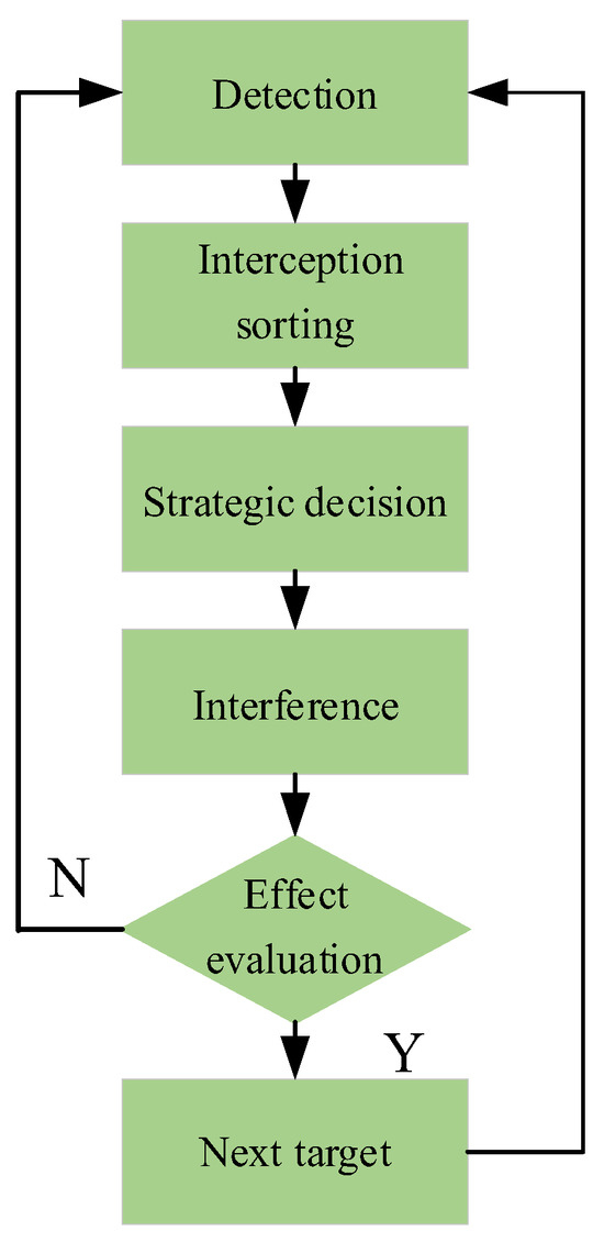 Figure 1 illustrates the process of radio fuze jammers interfering with radio fuzes. To implement effective jamming, the first step is to detect the radiated signals of the radio fuzes, followed by sorting the detected signals, i.e., detecting the operating frequency of the signals and analyzing their characteristics. A specific jamming method and waveform are then selected based on the signal characteristics. After the interference is executed, its effect is evaluated; if the interference fails, the process is repeated, and if the interference succeeds, the next target to be jammed is identified [5]. The jammer’s threat to radio fuzes is based on its ability to detect the radio fuze signal. The application of RF stealth technology in radio fuze design can prevent such detection, thereby stopping jammers from interfering with the fuze at its source.