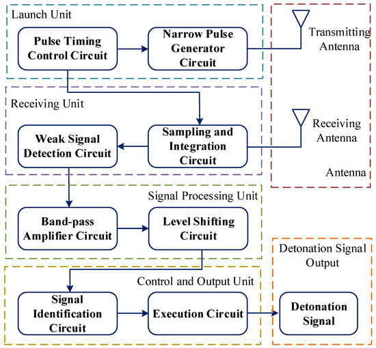 Figure 2 depicts the principal block diagram of the radio fuze, consisting mainly of the transmitting unit, receiving unit, signal processing unit, control and output unit, and antenna. The transmitting unit includes a pulse-timing control circuit, which triggers the narrow pulse generator circuit to produce nanosecond-wide pulses transmitted via the antenna. Simultaneously, it serves as a distance control gate, triggering the sampling pulse generator circuit to generate sampling pulses after a predetermined delay. The receiving unit comprises a sampling pulse circuit and a weak signal detection circuit. When the distance between the munition and the ground target matches the fuze’s preset detonation height, the sampling pulse circuit controls the weak signal detection circuit to sample the received echo signal from the antenna. The output signal from the receiving circuit undergoes processing in the signal processing unit, with the processed signal forwarded to the control and output unit. The control and output unit initiates the fuze by outputting the start signal.