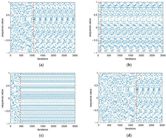 Chaotic sequences are highly sensitive to initial values, where even slight differences can lead to entirely divergent trajectories over iterations. The addition of the periodicity perturbation parameter can disrupt the closed state set of the original chaotic system, thereby eliminating short-cycle phenomena. To minimize interference with the original chaotic sequence, the signal-to-noise ratio between the original signal and the perturbation signal should significantly exceed unity [34]. Therefore, we chose a perturbation parameter as small as possible within the limits of accuracy to prevent excessive perturbation and ensure the chaotic sequence remains within its intended range. For this study, we chose 1 × 10−4 as the value of .