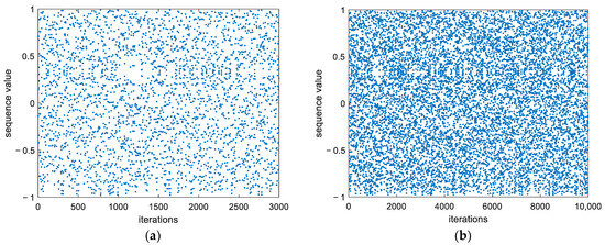 The approximation to chaos used in this study produces the map in Figure 4 when six bits are retained after the decimal point. Figure 4a illustrates the chaotic scatter plot after 3000 iterations, showing no observable periodic phenomena. Even with an increased iteration count of 10,000, as shown in Figure 4b, it still maintains good chaotic characteristics.