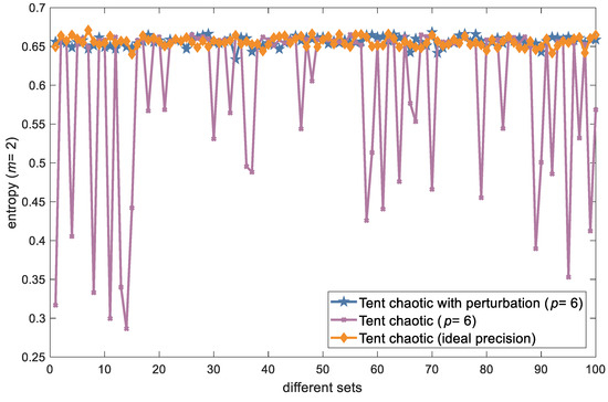 We calculated the approximate entropy in two dimensions for the Tent chaotic output sequence at ideal precision and compared it to those at finite precision (p = 6), both with and without the added perturbation parameter. Figure 5 illustrates the approximate entropy of these output sequences of the three chaotic systems, evaluated across 100 randomly selected sets of initial values. As depicted, the approximate entropy of the Tent-chaotic sequence remained nearly unchanged with the addition of the perturbation parameter under finite accuracy, closely resembling the entropy of the ideal accuracy scenario without perturbation. By contrast, without the perturbation parameter, the sequence’s approximate entropy exhibited instability and significantly lower complexity in certain initial value cases.