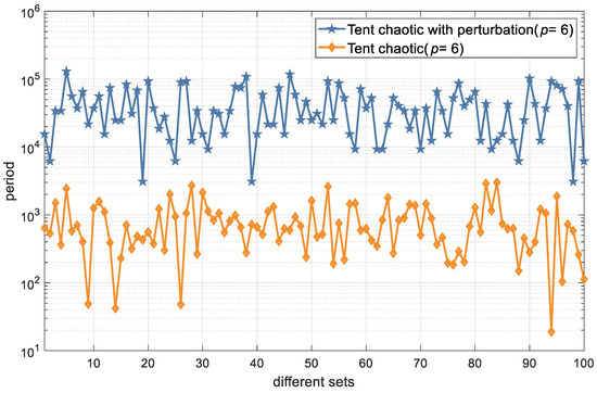 For precision p = 6, we calculated and compared the period length of 100 groups of chaotic maps with different initial values (Figure 6). It can be seen that the periods of the Tent chaotic sequences with the perturbation parameter are much larger than those of sequences without it.
