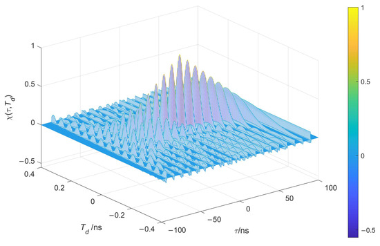 The ambiguity function (AF), initially proposed by P.M. Woodward to describe radar-modulation waveform characteristics, serves to depict not only the resolution of radar signals and the ambiguity levels but also measurement accuracy and clutter suppression [36]. Radio fuzes operate similarly to radar systems, allowing the AF to describe their detection performance. The AF evaluates a signal’s ability to distinguish between two targets at varying distances and velocities. In this study, we utilized the mean square error criterion to derive the ambiguity function for UWB signals.