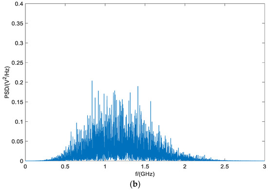 Following chaotic modulation, the peak power spectral density (PSD) of the UWB signal decreased by approximately 50%, significantly increasing the difficulty for reconnaissance and interference equipment to detect the fuze signal. Moreover, the modulated UWB fuze signal exhibited a more random frequency distribution. Figure 9a clearly shows a distinct spectral peak, facilitating targeted interference by interference equipment. By contrast, the chaotically modulated UWB signal lacked a prominent spectral peak, making it impractical for interference equipment to target specific frequencies.