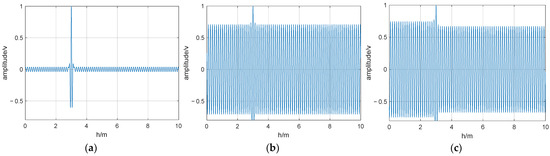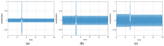 The parameters of the UWB fuze simulation model in this study were as follows: a pulse repetition frequency of ; a pulse width of ; the accumulation period of fuze-related processing set to ; the simulated rendezvous distance of the projectile at ; and a predetermined explosion height of . Figure 10 and Figure 11 show the correlation-detection output waveforms under optimal and non-optimal interference frequencies.