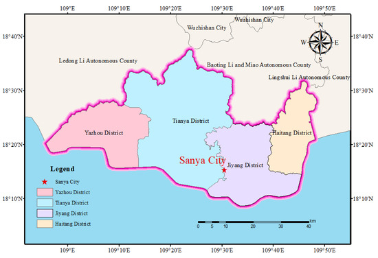 Sanya City is the second largest city in Hainan Province. It is located at the southernmost point of Hainan Island, covering a geographic extent from 18°09′34″ to 18°37′27″ N and from 108°56′30″ to 109°48′28″ E (as shown in Figure 1). The city is 91.6 km long from east to west and 51.8 km wide from north to south. Sanya City has a total land area of 1921 square kilometers and a total sea area of 3226 km2.