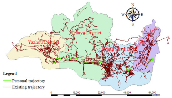 The existing trajectory data for this study were provided by Six Legs (http://www.foooooot.com/accounts/login/, accessed on 10 July 2023), which is an outdoor travel software platform developed by Beijing Genghi Technology Co., Ltd. (Beijing, China). It provides users with powerful GPS trajectory recording capabilities, enables the convenient sharing of travel, allows diverse offline map downloads, and can be used to browse millions of outdoor travel routes at any time. The personal trajectory section was collected by the author during her research trip to Sanya using the Six Legs app (as shown in Figure 2).