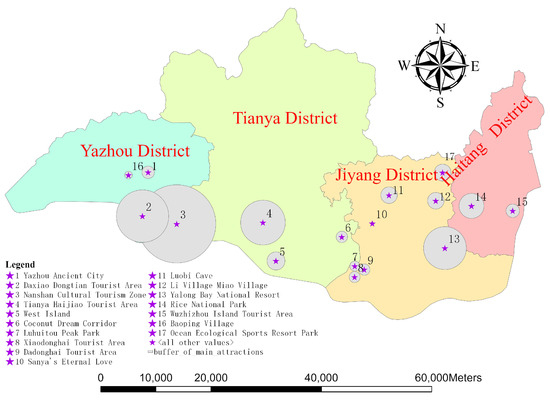 Buffer radius of each scenic spot (Rj): The buffer radius of each scenic spot was calculated based on its area Si, and then the buffer of each scenic spot was established to conform to its corresponding buffer radius. The specific buffer is shown in Figure 3. Because the area of each scenic spot is different, the buffer radii are also different.