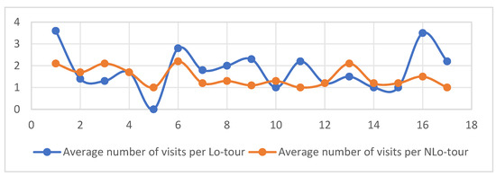 Average number of visits by Lo-tour and NLo-tour to the 17 scenic spots.