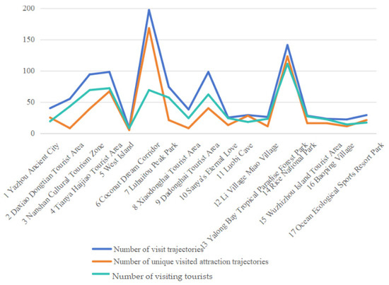 Generally speaking, the more visits and tourists a scenic spot attracts, the more popular it becomes. The Figure 5. shows the number of visitation trajectories, the number of trajectories visiting unique scenic spots, and the number of visiting tourists for the 17 scenic spots. There is a strong correlation between them, with peaks occurring in the same scenic spot.