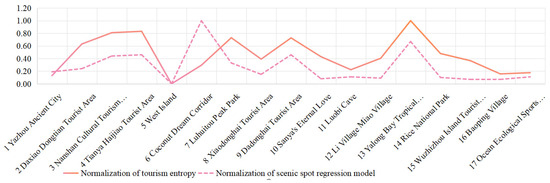 In this study, an attraction regression model was created for each scenic spot using SPSS, as shown in Formula (10), where the dependent variable Y is the attraction of each scenic spot, and the other independent variables are the number of visiting trajectories (X1), the number of unique visited trajectories (X2), and the number of visiting tourists (X3) for each scenic spot.
