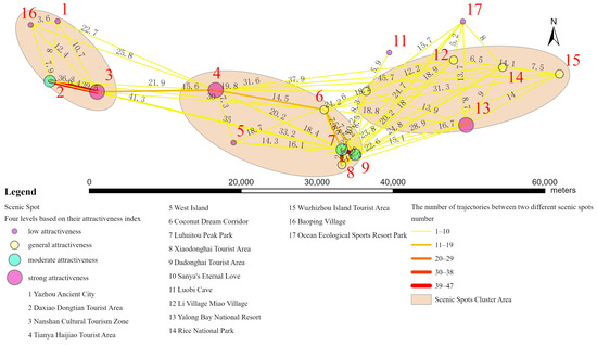 The network relationship between scenic spots was created by tracking tourism trajectories, as shown in Figure 9. In Figure 9, points of different colors and sizes represent scenic spots with different levels of attractiveness. The data on the line represent the distance between the two connected scenic spots, and the color and thickness of the line represent the number of trajectories connecting the two scenic spots. It can be seen that the closer the distance between scenic spots, the more trajectories connect them. According to the spatial distribution of scenic spots and the network relationship between them, scenic spots can be divided into three cluster areas, each consisting of scenic spots with higher levels of attraction and a certain number of neighboring scenic spots. From left to right, based on the main characteristics of the scenic spots, the cluster area can be divided into cultural heritage areas, natural landscape areas, and leisure and entertainment areas.